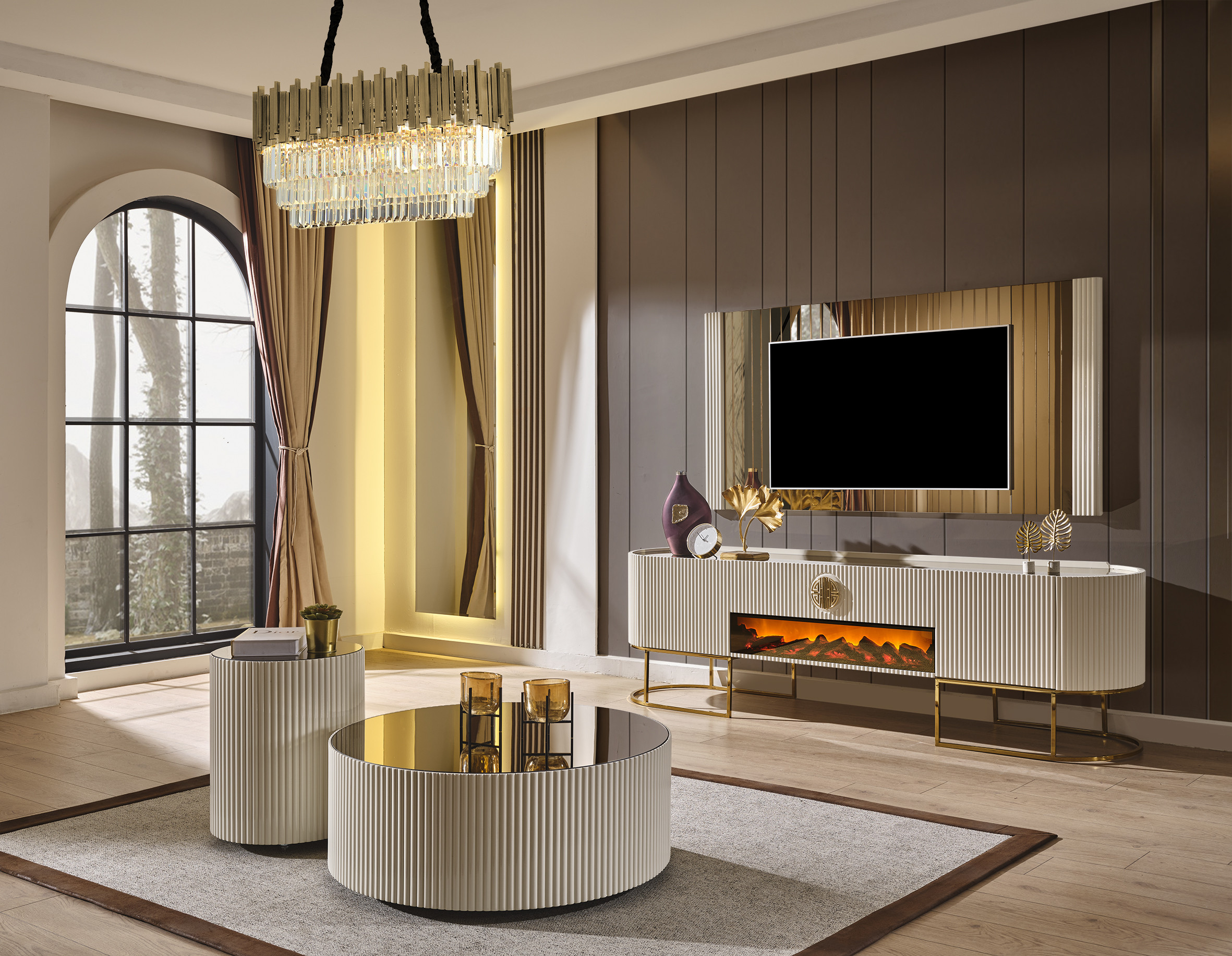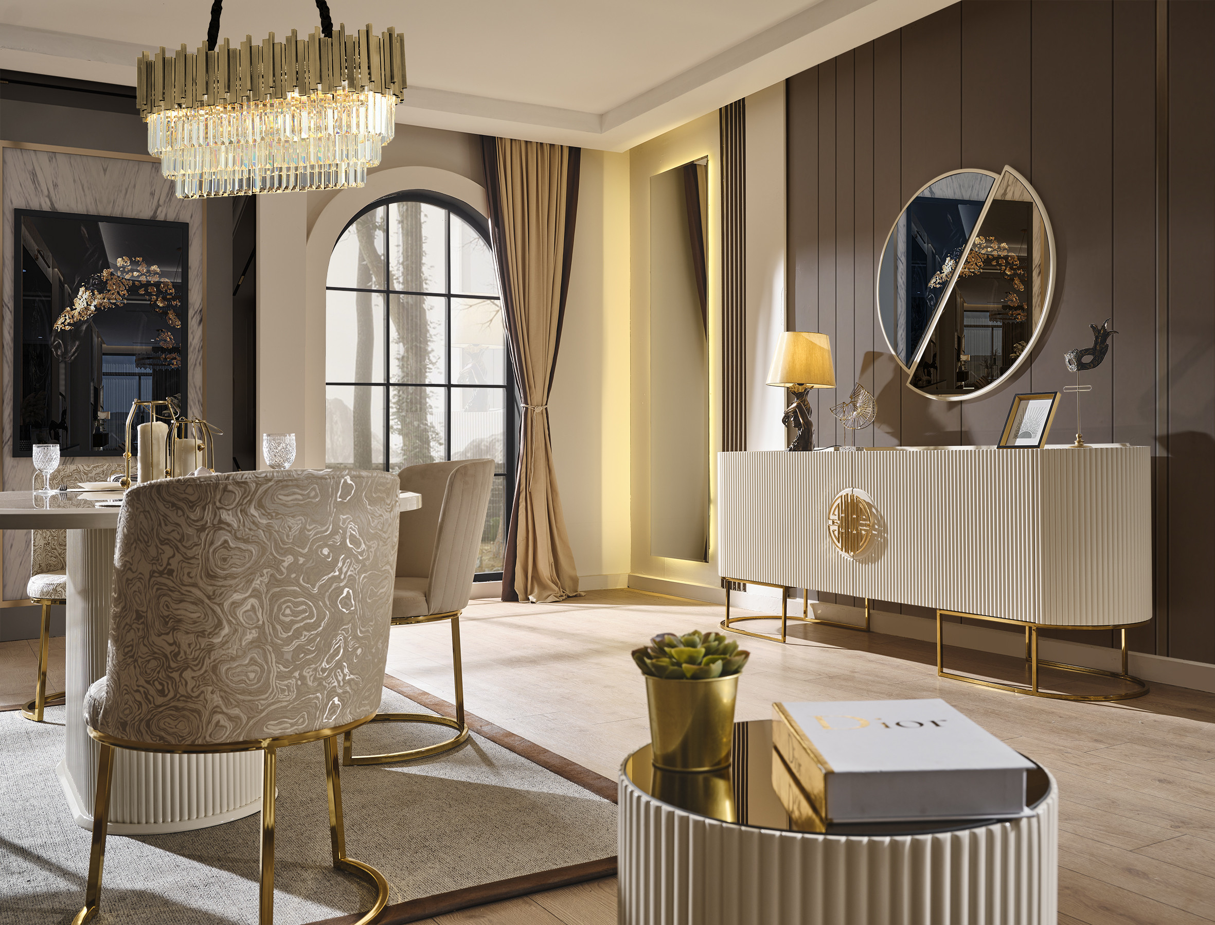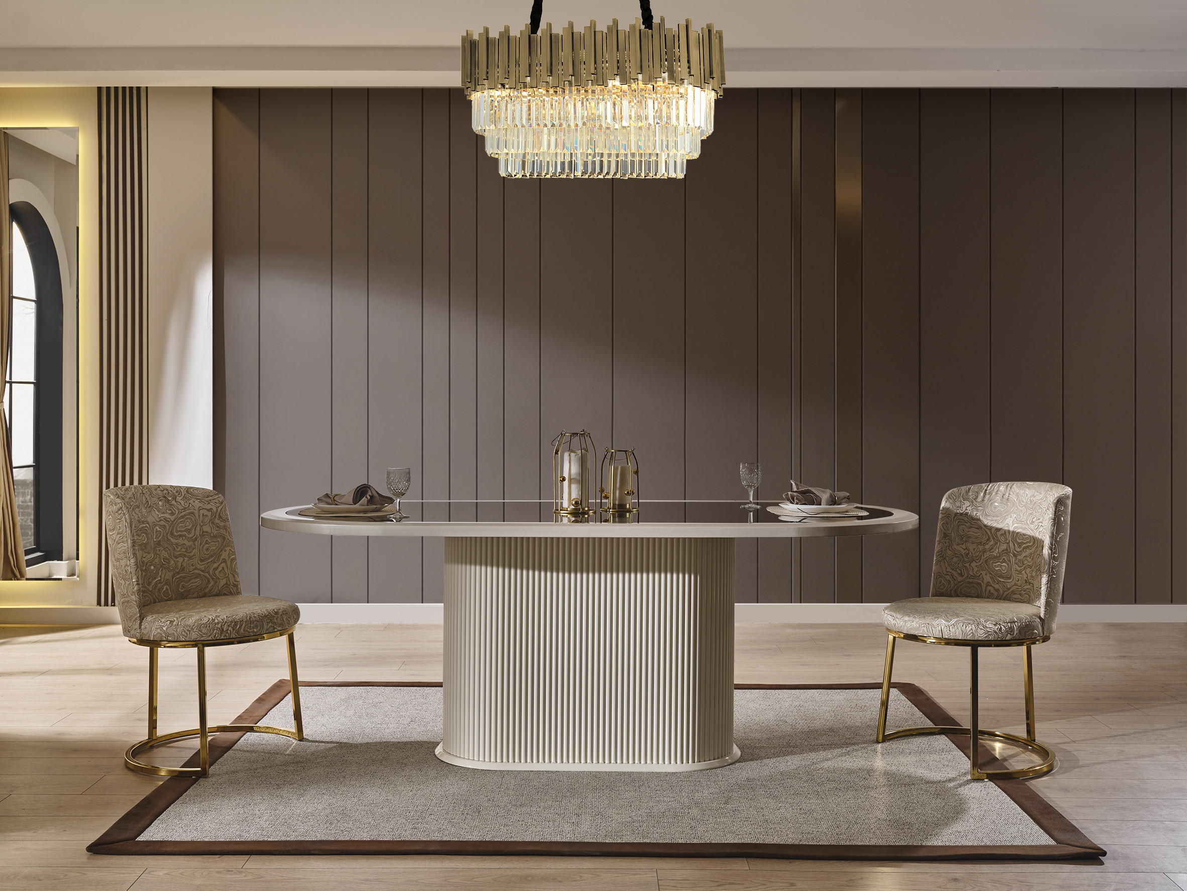 Bu şık yemek odası, yemek alanınızı sofistike bir hale getirecek. Setin tamamı, ahşap ve metalden üretilmiştir ve her bir parçasında kalite ve zarafet görülmektedir. Ahşap malzemeler, dayanıklı ve sağlam bir yapının yanı sıra doğal bir görünüm sunar. Metal aksam ise modern ve şık bir dokunuş olarak tasarlanmıştır.